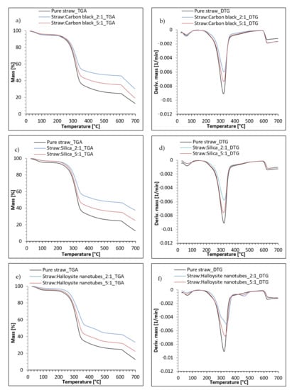 Figure 10 shows the course of the TG (thermogravimetry) and DTG (derivative thermogravimetry) curves of the fillers based on straw. During the decomposition of the materials on the DTG curves, peaks related to the ranges in which there was an intense mass loss were observed. In each case, the fillers were decomposed in several stages. For all the fillers, a peak was recorded in the temperature range of 50–120 °C. The loss of mass in this region corresponded to the evaporation of the moisture contained in the samples. The endothermic peak corresponded to the loss of physically adsorbed water and interlayer water. Pure_Straw had the greatest ability to absorb water, which was confirmed by thermal analysis by recording the greatest loss of mass in the range of these temperatures. In the next stage, covering a wide temperature range, the filler decomposed mainly due to the degradation of the lignocellulosic material. At this stage, in the temperature range of 180–500 °C, thermal degradation of the main straw composition (cellulose, hemicellulose and lignin) began [65]. In the case of fillers containing halloysite, a slight endothermic peak was observed in the region of 430–500 °C, related to dehydroxylation [66]. In this region, the release of OH groups from the octahedral coordinated Al3+ ion and the formation of a “metalloysite” took place [67]. In the case of carbon black and silica, which were components of the remaining fillers, no changes were noted in the tested range. This was because they were stable at these temperatures.