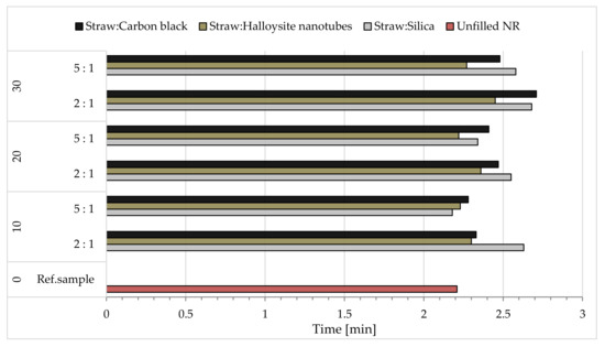 The influence of the type and content of the hybrid fillers used on the rheometric parameters of the obtained elastomer blends was investigated. On their basis, a comparison was made with the reference mixture, which is unfilled natural rubber. The results of the minimum (Mmin) and maximum (Mmax) torque and its increase ΔM during vulcanization are presented in Table 4, while the determined optimal cross-linking times (t90) are presented in Figure 11.