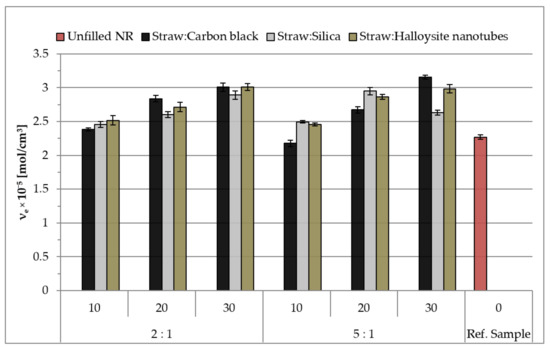 Based on the measurements of the equilibrium swelling of the samples in toluene, the cross-linking density of the vulcanizates was calculated. The calculations were made according to the Flory–Rehner equation [56] (Equation (1)).