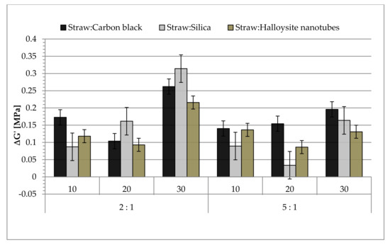 In this case, the influence of the architecture of filler particles on the tested properties of biocomposites should be taken into account, as carbon black and silica particles have a spherical shape, and halloysite has a tubular structure. Moreover, the specific surface area and aspect ratio also affect the varying degree of “packing” of the particles.