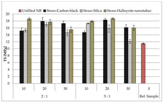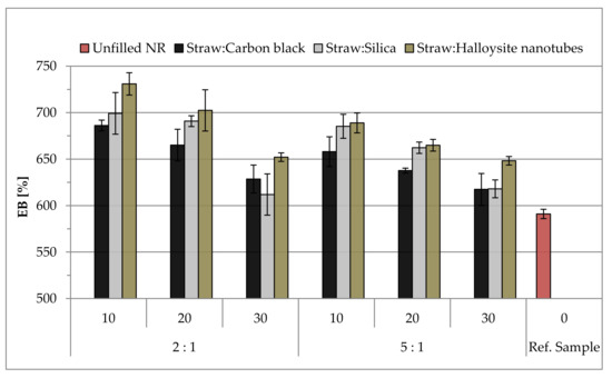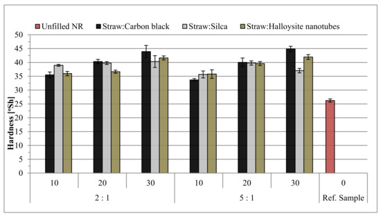 The reference sample was a filler-free natural rubber composition with a cross-linking system. The remaining blends additionally contained hybrid fillers in amounts of 10, 20 and 30 phr. Hybrid fillers were mixtures of cereal straw with functional nano-additives, i.e., carbon black, silica or halloysite, in which the weight ratios were, respectively, straw:nano-additive 2:1 and 5:1.