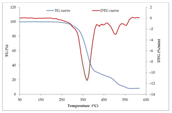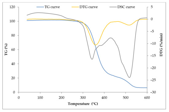 Thermal analysis of hybrid fillers was carried out in a range of temperature of 25–700 °C. Up to 600 °C, measurements were made in argon atmosphere (55 mL/min), while from 600 °C to 700 °C, the pyrolysis residue was burnt in air (55 mL/min). The heating rate of both steps was 20 °C/min. Measurements were recorded using a TGA analyzer (Mettler Toledo, Greifensee, Switzerland).