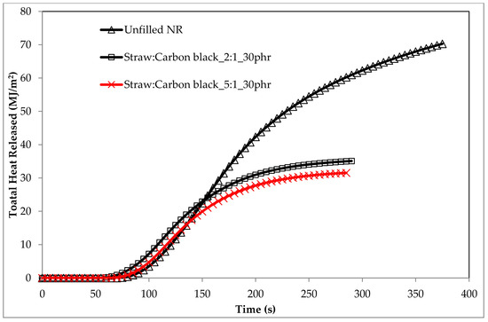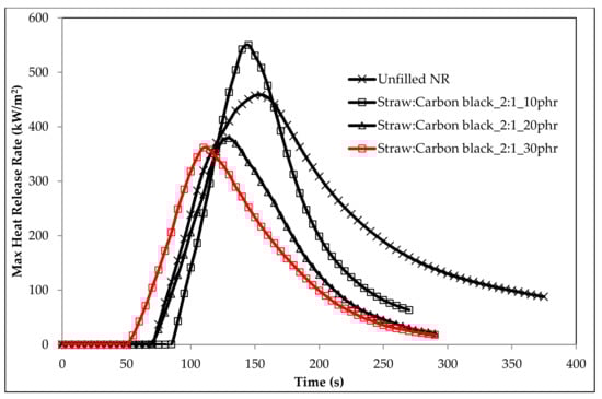 The flammability of natural rubber composites was tested using a cone calorimeter (Fire Testing Technology Ltd., East Grinstead, UK). Vulcanizate samples with dimensions of 100 mm × 100 mm × 2 mm were tested in a horizontal position using a 35 kW/m2 incident heat flux.
