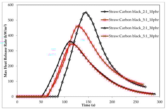 In the case of hybrid fillers, the residue after combustion was much higher, because the samples contained a thermally stable nano-additive that did not degrade in the tested temperature range. The highest R700 value was found for hybrid straw fillers containing silica. A lower value of the residue was observed for the straw:carbon black fillers, which resulted from the fact that carbon black contained a large amount of bound water, which evaporated in the initial stage of pyrolysis. Hybrid fillers with halloysite were characterized by the lowest amount of solid residue. In this case, the processes of dehydration and dehydroxylation of HNT took place during pyrolysis, which was associated with the separation of water from the sample, which resulted in an additional loss of filler mass.