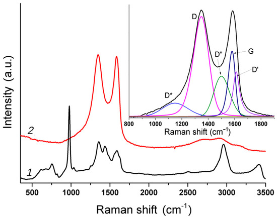 Micro-Raman spectra of the rGOA-MS composite taken from two spots with the dominant contribution of MS (1) and rGO (2). The inset shows a deconvolution of the rGO spectrum into separate peaks as suggested in [67].