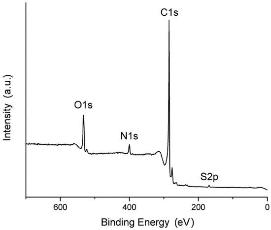 Figure 3 shows the survey XPS spectra of the rGOA-MS sample. The elemental composition of the surface, calculated using the integral intensities of the analytical lines (marked in the figure), corresponds to formula C0.88O0.08N0.03S0.01. The surface composition is different from that of the bulk (see Table 1). In particular, the surface has lower nitrogen and oxygen concentrations. The nitrogen depletion at the surface may indicate a low electrocatalytic efficiency of rGOA-MS for oxygen reduction. However, this result is not conclusive because the surfaces accessed in the XPS experiment and involved into the redox reaction may be different.