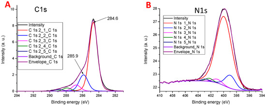 XPS spectra were obtained using a Specs PHOIBOS 150 MCD electron spectrometer (SPECS GmbH, Berlin, Germany) with a Mg cathode (hν = 1253.6 eV). The vacuum in the spectrometer chamber did not exceed 4 × 10−8 Pa. The survey spectra were recorded in the constant transmission energy mode of 40 eV whereas the individual lines were recorded with 10 eV. The survey spectra and individual lines were recorded in 1.00 eV and 0.03 eV increments, respectively. The background subtraction was carried out according to the Shirley method [54], and the spectra decomposition into mixed Gaussian–Lorentz peaks was performed using the Casa XPS software (version 2.3.19, Casa Software Ltd, Teignmouth, UK). Quantification of atomic content was done using the sensitivity factors from the CasaXPS elemental library.