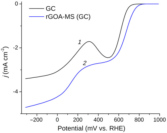 Linear sweep voltammetry in an O2-saturated solution of 0.1 M KOH for the glassy carbon (GC) electrode (1) and GC coated with rGOA-MS (2), v = 10 mV/s, ω = 2000 rpm.