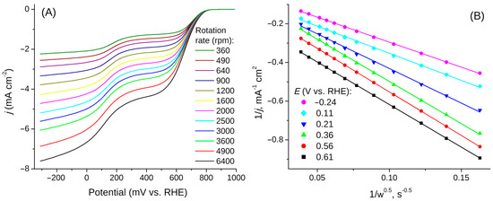 The LSVs at the GC electrode coated with rGOA-MS at different electrode rotation rates, v = 10 mV/s (A); K-L plots at selected potentials (B).