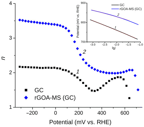 The linear sweep voltammetry carried out in a solution of 0.1 M KOH saturated with oxygen for the glassy carbon electrode loaded with rGOA-MS as well as for the initial GC are presented in Figure 5 (the electrode rotation rate was 2000 rpm and the potential scan rate was 10 mV/s). Based on the results of processing voltammograms measured at different electrode rotation rates (Figure 6A), from the slope of Koutecký–Levich (KL) plots (Figure 6B) and in accordance with Equation (1), the number of electrons n participating in the oxygen reduction reaction were defined at various potentials in Figure 7. The inset in Figure 7 depicts Tafel plots for the investigated objects. The slopes of lines are 50.3 mV/dec and 33.8 mV/dec for the initial GC and rGOA-MS, respectively, which are consistent with the values reported in the literature [72,73]. As can be seen from Figure 5, the GC electrode coated with rGOA-MS demonstrates somewhat higher oxygen reduction currents than the initial GC. On the LSV curve for rGOA-MS (curve 2 in Figure 5), two distinct waves can be distinguished, which correspond to the reduction of oxygen to hydrogen peroxide in the potential range from 300 mV to 650 mV (n ≈ 2) and water at E < 100 mV (n ≈ 3.4–3.5). Thus, a noticeable catalytic effect towards the oxygen reduction reaction is observed for rGOA-MS, namely, there is a ca. 60 mV decrease in the ORR overpotential and higher values of n are observed for rGOA-MS at E < 300 mV as compared to glassy carbon. The results obtained are less prominent as it was for a reduced graphene oxide aerogel [38], which demonstrated a ca. 90 mV decrease in ORR overpotential and higher values of the electron transfer number (n ≈ 2.4–2.8 in the potential range from 350 mV to 550 mV). Evidently, the observed effect is rather small, which is caused by a low concentration of active centers (surface defects, edge regions of graphene-like structures, and dopant atoms embedded into graphene layers) on the surface of rGOA-MS for the adsorption of both O2 and intermediates of its reduction. It can be assumed that in accordance with [23], insufficient catalytic activity of rGOA-MS is due to the low surface concentration of pyridine-like nitrogen. The thermal treatment of the composite could likely increase the surface concentration of nitrogen. Moreover, the melamine sponge in the composite also affects the total concentration of active centers, which is lower than that for a reduced graphene oxide aerogel [38].