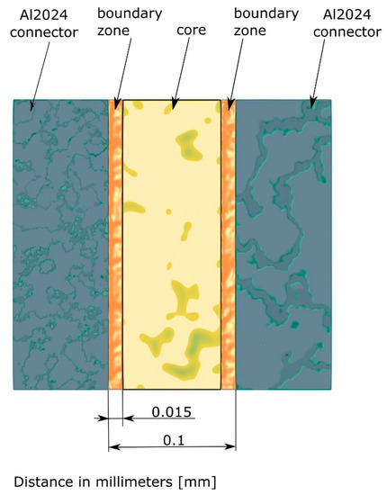 Literature sources indicate differences in the measured values of the tensile strength of adhesive materials in terms of the shape of the bulk adhesive specimen, compared to the tensile strength of joints of different thickness in the butt joint. The gradual decline of these differences was also observed with the increase in the thickness of the adhesive joint [10,12]. Also, in the course of the present authors’ research, a decrease in the strength of the butt adhesive joint was observed with the increase in the thickness of the joint. This may have been due to the increased amount of defects and other factors compromising the cohesive strength of the joint that can be expected with larger adhesive joints. The observed reduction of joint strength, understood in this way, may have been caused by the lack of direct contact of the joint core with the joined material during the joint cross-linking, which resulted in the disorganization of monomer molecules. Another issue that should be discussed in terms of changes in the physical properties of the adhesive in the joint is the cross-linking of polymers. Cross-linking occurs by means of van der Waals interactions or covalent chemical bonds. The strength of these interactions is correlated with cross-link density. The high-density polymer network is characterized by a greater number of knots, which usually results in increased stiffness of the cured polymer material [1,13,14,15]. In joints with a thickness greater than 0.15 mm, this phenomenon is confined to the boundary zone, and its effect on the material properties gradually disappears. In the authors’ own research of the properties of thin adhesive layers, the presence of boundary zones with different material properties compared to the joint core was observed. The thickness and differences in the values of Young’s modulus and the hardness of individual layers was determined. The obtained results were then analyzed in terms of single-lap adhesive joints. Following nanoindentation tests, it was found that each boundary zone with an increased Young’s modulus reached up to 0.015 mm from the joint edge, which constituted, in total, up to 30% (for two boundary zones) or more of the total joint thickness, assuming that it was about 0.1 mm in thickness. The value of Young’s modulus in the boundary zone was 15% higher compared to the core value [7]. In the aforementioned research, no destructive tests were carried out and no direct comparison of the experimental results with the numerical simulation was made; as such, these notions are the subject of the present article. A schematic representation of an adhesive joint with zone division is shown in Figure 1.