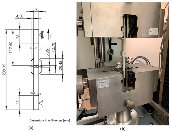The aim of our research was to develop and experimentally verify a new approach to the modelling of an adhesive joint, which takes changed adhesive material properties of the joint into account. Adhesive material properties cured in adhesive joints differ in comparison to bulk adhesive material properties. In order to verify the presented assumptions, double-lap samples were made in accordance with the ASTM D3528 standard [18]. The samples were made in the form of panels which, after joining, were cut into individual samples. Connectors and laps were made of AW 2024-T3 aluminum alloy. The surface of connectors and laps was cleaned with Loctite SF 7063 universal cleaner using a cloth, then brushed with a P320-grade, nonwoven fabric and cleaned again with a universal cleaner. The surface of the connectors and laps prepared in this way was plasma plated. Plasma plating was carried out in three head passages at 150 W, helium flow 30 L/min, and oxygen 0.3 L/min. The elements were joined with Loctite Hysol EA 9392 Aero adhesive, which is a two-component adhesive for joints used in the aviation industry. It is characterized by its high strength within a large temperature range, to which adhesive joints used in aviation structures are often subjected. The adhesive used is intended for joining metal, composites, and honeycomb elements. The adhesive is used by most of the leading part manufacturers in the aviation industry. The adhesive was prepared in proportion to weight, in accordance with the manufacturer’s recommendations, and evenly distributed on the adhesive surfaces using a special spatula. The lap was positioned in relation to the connectors on the fixing pins. The joint was cured for 24 h at room temperature with pressure in a vacuum sleeve, under a pressure of 0.1 MPa. After seven days, the panels were cut with a waterjet into individual samples with a width specified in the standard—25.4 mm. The samples were cleaned of the adhesive flash to maintain the lap length specified in the standard. All relevant dimensions were checked and the thickness of the adhesive bond was measured before starting the test. Joint thickness was measured with a Keyence VHX-5000 digital microscope. The average bond thickness of ten samples was 0.102 mm with a coefficient of variation of 1.72%. Two strength tests were carried out at room temperature. In the first test, five samples were tensile tested with the use of a traverse. In this way, the average destructive force of the adhesive joint was determined. The second tensile test was carried out with an extensometer which was compliant with the standard PN-EN ISO 9513: 2013-06. The samples were stressed up to 70% of the destructive stress value, determining the stress-strain characteristics for the considered joint. Five repetitions were performed for each series. A drawing of the sample with its dimensions and boundary conditions (a), and a photograph of the sample in the test rig of the Zwick Roell Z150 testing machine (b), are shown in Figure 2.