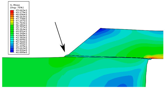 The bitmap in Figure 4 presents a visualization of the stress distribution in a double-lap joint. Because stresses were symmetrically distributed in all four joints of the double overlap sample, one-fourth of the model was presented. The deformation coefficient was increased to ×150 in order to illustrate the deformation of the adhesive joint. The image shows the deformation of the joint due to tension at the end of the lap. The end of the lap is indicated since it was the region where destruction of the adhesive joint was initiated by normal stresses in the adhesive joint that arose during the shearing of the joint. Tension along the thickness of the joint can be observed. It is important to mention that the Young’s modulus of the adhesive influences the potential for the deformation of laps and connectors of the adhesive connection.