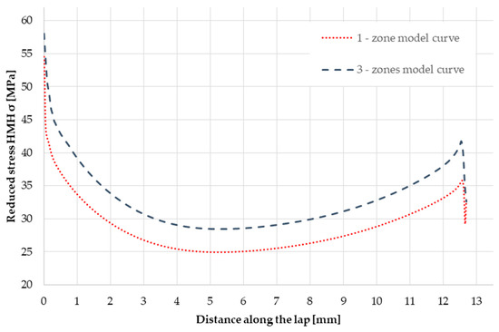 Figure 7 presents simulation curves of reduced stresses along the length of a model lap, i.e., along the dimension 12.7 mm. Nodes that were in direct contact with the connector material were selected for comparison. In this case, the difference in stress at the end of the lap was observed, which affected the initiation of joint destruction. Due to the analogies between the construction of the numerical one- and three-zone models, a similar shape of the curves was observed. The results can also be analyzed in terms of the subsequent destruction of the adhesive joint, which was often of an adhesive or adhesive-cohesive nature. Higher stresses in the boundary zone were directly related to the destruction of the joint and the difference in the material properties of the adhesive in the joint core and the boundary zone; consequently, a different stress state in these areas may be considered as one of the reasons for the observed destruction.