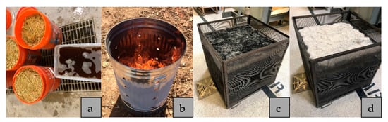 Rice husk ash (RHA) and rice straw ash (RSA) production process; (a) Water pretreatment; (b) initial burning; (c) ash after initial burning; (d) ash after final burning in the kiln.