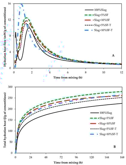 Hydration heat of samples containing silica fume. (A) heat flow, and (B) total hydration heat.