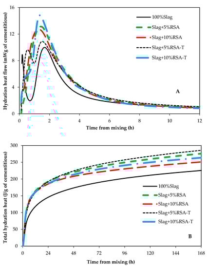 All samples containing either SF, RSA, or RHA showed higher heat of hydration compared to the control sample. When comparing samples that contained SF, it can be seen from Figure 3B that sample with 5%SF had the highest heat of hydration. The sample containing 5% treated RSA (Slag + 5%RSA-T) had the highest heat of hydration among samples that contained RSA (Figure 4B). However, comparing samples containing RHA, Figure 5B shows that Slag + 10%RHA-T had the highest amount of hydration heat. Samples containing SF showed almost no induction period (Figure 3A). A similar trend was seen in samples containing RSA (Figure 4A). It seems like the heat of hydration of AAS samples containing treated samples does not correlate to the compressive strength for the highest compressive strength was achieved in samples that contained 10% of SF-T, or RSA-T, or RHA-T. This could be because treated samples were immersed in the activator solutions for 24 h; during this stage, some heat could have been released by the materials. Therefore, the amount of hydration heat of samples containing treated samples would be lower than those containing untreated ones.