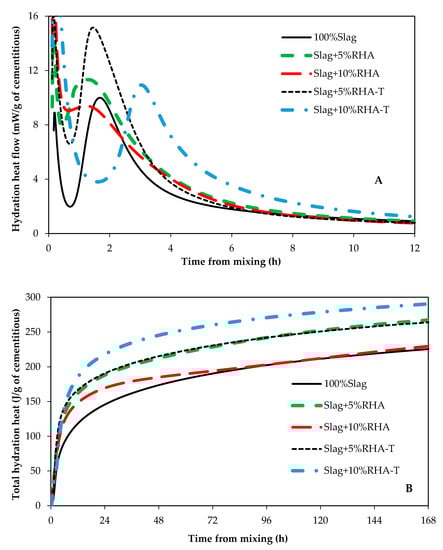 Hydration heat of samples containing rice straw ash. (A) heat flow, and (B) total hydration heat.