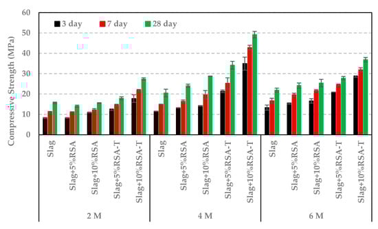 The impact of activator concentration on compressive strength of alkali activated slag mortar samples was measured in order to obtain the optimum activator concentration (molarity). Activator solutions at three different concentrations (2 M, 4 M, and 6 M) were used. As shown in Figure 6, the compressive strength of control sample increased with an increase in the activator concentration. However, samples containing RSA or RSA-T performed best at 4M concentration. A decrease in the activator concentration increases the modulus ratio (SiO2/Na2O) and a decrease in Na2O % of the solution. Therefore, 4 M NaOH activator gives the optimum modulus ratio and sodium oxide content for samples containing RSA (treated or untreated).