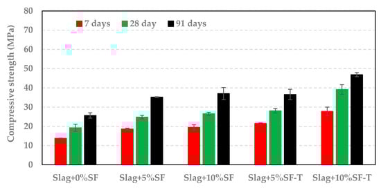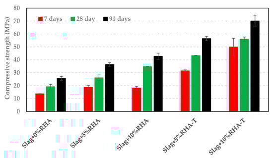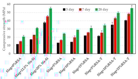 The influence of RSA, RHA, and SF on mortar workability was investigated with the 4M activator solution. The addition of RSA, RHA, and SF as partial replacement of slag had variable effects on alkali activated slag mortar flow. The samples containing RSA or RHA decreased the flow, as shown in Table 3. However, the samples containing 5%SF or 5%RHA-T had a higher flow compared to the control (slag) sample. The lowest flow was recorded for samples containing 10%RHA-T while sample containing 5%SF had the highest flow. It has been shown that SF when used up to 15% in ultra-high performance concrete increases workability [,]. This has been attributed to lubrication effect of silica fume. Higher flowability of samples containing 5% SF or 5%RHA-T could be the lubrication effect of SF and RHA-T. However, the decrease in flow of samples containing RSA, RHA, RSA-T, or SF-T could be attributed to a couple of factors: (1) the absorption of activator solution by these materials due to their high surface areas [,]; (2) the faster formation and growth of hydration products in these samples.