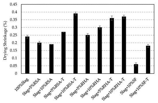 The drying shrinkage of AAS mortar samples is shown in Figure 10. Addition of RSA in mixtures reduced the drying shrinkage; however, samples containing RSA-T had a higher drying shrinkage compared to the control samples. Adding RHA or RHA-T to AAS mixtures increased the drying shrinkage. However, the addition of either SF or SF-T substantially reduced the drying shrinkage. Among all samples prepared, those that contained 10% treated ash samples (10%RSA-T or 10%RHA-T) showed the highest drying shrinkage (about 60% more than the control sample). The lowest drying shrinkage was obtained for sample containing 5% SF (75% reduction in drying shrinkage).