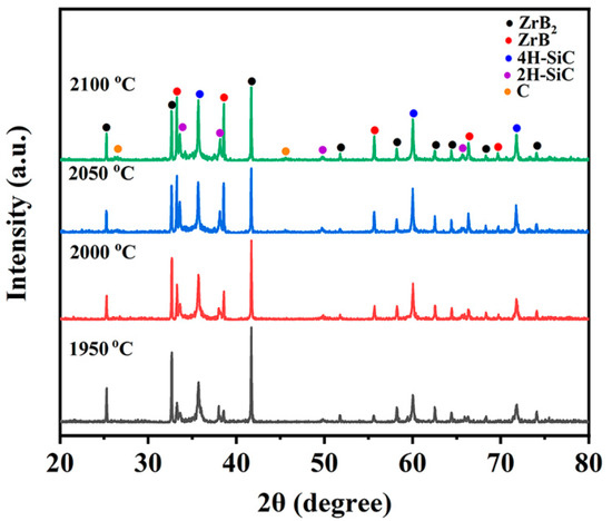 The XRD patterns of the P70Z15A15 by different temperatures were shown in Figure 3. ZrB2, ZrB, C, and SiC peaks were mainly detected, without the presences of AlN peaks. The reason is as follows: AlN dissolves into the SiC lattice to form a continuous solid solution in the present processing temperature. 2H-SiC and 4H-SiC were observed, both belonging to α-SiC. This was also in agreement with the SiC-AlN phase diagram [38]. During the pyrolysis process, PCS will not only release small-molecule gas, but also a small amount of free carbon will inevitably be generated, so the C peak will be detected in XRD patterns [1]. As the temperature increased, the intensity of ZrB peak gradually increased, which indicated that higher temperature was beneficial to the generation and stability of ZrB. Further studies are under way on investigating ZrB.