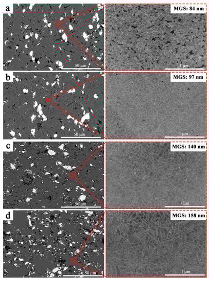 The SEM images of the P70Z15A15 at different temperatures were shown in Figure 4. The white phase was ZrB2. The overall distribution of ZrB2 was uniform, but agglomeration phenomenon was also observed between ZrB2 particles. As a reinforcing phase, ZrB2 can increase the crack propagation pathway, hinder the crack propagation, cause crack deflection, detour, or branch, thereby improving the mechanical properties [34]. The black areas were pores. Due to ion etching on the sample surface, an etching boundary was formed in areas with more pores. The gray area was the solid solution matrix by SiC-AlN. It can be seen from Figure 4a that when the temperature was 1950 °C, the grain size distribution of the SiC-AlN solid solution became more uniform, its mean grain size (MGS) was 84 nm, and the shape was basically equiaxed. Since the sample was not densified under this temperature, more pores appeared. When the temperature increased further up to 2000 °C, oriented grain growth occurred, and elongated grains were formed (Figure 4b). The MGS was 97 nm. Such presence of nano-scale grains had a strong influence in enhancing the mechanical properties of the (SiC-AlN)/ZrB2 composite [39]. When the temperature further increased, the elongated crystal grains further increased, and the MGS also increased with the temperature increase (Figure 4c,d). At 2100 °C, the MGS was around 158 nm. The increase in grain size would play a negative role in mechanical properties of the (SiC-AlN)/ZrB2 composite. On the whole, secondary ZrB2 phase in the (SiC-AlN)/ZrB2 was on micron-level, while (SiC-AlN) was on nano-level. This nano-micron composite structure was a critical reason for revealing mechanical properties of (SiC-AlN)/ZrB2 composite.