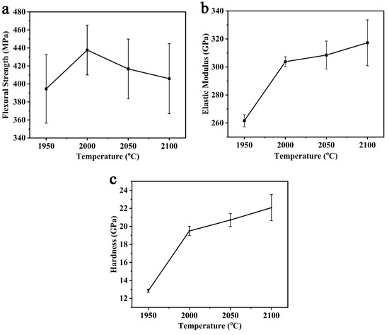 The mechanical properties of the P70Z15A15 by different sintering temperatures were shown in Figure 5. It can be seen from Figure 5a that the flexural strength of (SiC-AlN)/ZrB2 increased by increasing temperature in the range of 1950–2000 °C, reaching the maximum value (438 ± 28 MPa) at 2000 °C. The increase in flexural strength from 1950 °C to 2000 °C was due to the removal of residual pores. In this temperature range, the relative density of (SiC-AlN)/ZrB2 increased from 90.27% to 94.86% (Figure 2a). The increase in relative density greatly increased the strength. However, from 2000 °C to 2100 °C, the flexural strength of (SiC-AlN)/ZrB2 composite showed a slight decrease by 7.26%. When the temperature further increased from 2000 °C to 2100 °C, the relative density increased from 94.86% to 95.98% (Figure 2a). However, as the temperature increased, the (SiC-AlN)/ZrB2 composite experienced over-sintering, and obvious grain growth occurred (increased by 60%, Figure 4), which has a stronger impact on its flexural strength. According to the Hall–Petch relationship, the flexural strength is inversely proportional to grain size [40]. Therefore, compared with the increase in relative density, grain growth effect dominated in the range of 2000–2100 °C. It can also be seen from Figure 5b,c that elastic modulus and hardness followed the same regularity with relative density (Figure 2a). As the temperature increased from 1950–2000 °C, elastic modulus and hardness increased remarkably (by 16.08% and 51.67%, respectively) due to the increase in relative density. However, from 2000 °C to 2100 °C, the relative density increased only by 1.12%, and the corresponding elastic modulus and hardness increase (by 4.45% and 13.29%, respectively) was presumably due to the solid solutioning effect. The elastic modulus and hardness were 317 ± 16 GPa and 22.08 ± 1.45 GPa, respectively, for P70Z15A15 sintered under 2100 °C.