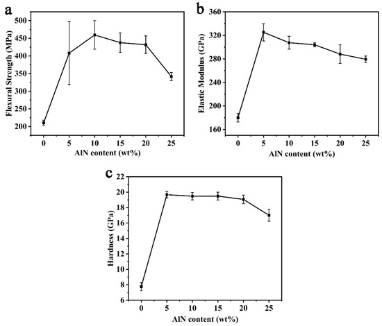 Figure 6 shows the mechanical properties of (SiC-AlN)/ZrB2 composite by the addition of 15 wt% ZrB2 at 2000 °C under different AlN content. Under different AlN content, the strength of (SiC-AlN)/ZrB2 increased firstly before decreasing (Figure 6a). The flexural strength was only 211 ± 7 MPa without AlN addition. Additionally, when the AlN content was 10 wt%, the flexural strength of (SiC-AlN)/ZrB2 composite increased up to 460 ± 41 MPa (increased by 118% compared to counterpart without AlN). The elastic modulus (Figure 6b) and Vickers hardness (Figure 6c) of (SiC-AlN)/ZrB2 composite increased firstly and then decreased as well, both of which reached maximum values with 5 wt% AlN: 325 ± 15 GPa (1.8 times that of the sample without AlN) for elastic modulus, and 19.67 ± 0.43 GPa (2.53 times that of the sample without AlN) for hardness, respectively. Such remarkable increases were mainly due to the relative density increase. Meanwhile, the MGS of (SiC-AlN)/ZrB2 composite was 97 nm (Figure 4b). This was due to the in-situ formation of SiC by precursor pyrolysis and the effect of AlN on refining SiC grains. Under the sintering temperature range of SiC, AlN has a higher vapor pressure and a higher diffusion coefficient than SiC. The migration rate of AlN to SiC is much greater than its reverse migration rate. So that AlN can preferentially diffuse to the surface of SiC grains. On one hand, it provided a diffusion barrier and inhibited the grain growth of SiC. On the other hand, AlN can react with SiC in a solid solution, and re-nucleate around the mutual-interface, and refine the grains [41]. The grain refinement down to nanoscale decreased the critical defect size and improved the material strength. It is generally believed that the effect of AlN on refining SiC grains mainly occurs in the low AlN range. Meanwhile, AlN is relatively “softer” (~12 GPa) than SiC (~20 GPa) [42]. Therefore, the addition of higher AlN content (>10 wt%) could hardly improve mechanical properties of (SiC-AlN)/ZrB2 composite to higher values.
