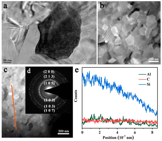 Figure 7a shows the transmission electron microscope (TEM) image of the P75Z15A10 at 2000 °C. ZrB2 (dark phase), and SiC-AlN solid solution (gray phase) were observed. Figure 7b,c analyzed the SiC-AlN solid solution by high-angle annular dark field (HAADF) technique. It can be seen from Figure 7b that the grain size of the SiC-AlN solid solution phase was 100 nm, and the morphology of both equiaxed and elongated grains was consistent with SEM observation (Figure 4b). Meanwhile, wrinkles were observed inside the grains, which were caused by phase segregation. Figure 7e was the line scanning of (orange line) in Figure 7c. The elemental distribution of carbon was uniform. Compared with C, slight fluctuation in compositional distribution of Al was observed. Gradient segregation of Si was more serious (Figure 7c), indicating that the solid solution formation of SiC-AlN might not accomplished. Figure 7d was the selected area electron diffraction (SAED) pattern of the SiC-AlN solid solution phase. The diffraction pattern of nano matrix phase was a polycrystalline ring, the calculated lattice plane from the inside to the outside was (1 0 5), (2 0 3), (2 1 3), (1 0 3), (2 0 0), (1 0 7). Among them, (1 0 5), (2 0 3), and (1 0 7) crystal planes belong to 4H-SiC, and (2 1 3), (1 0 3), and (200) planes belong to 2H-SiC, which was consistent with XRD verifications.