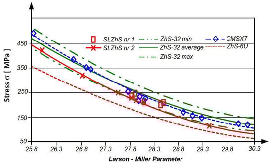 Influence of temperature and exploitation time on the exploitation stress of ZhS alloys used in the construction of RD-33 engine turbine blades, as defined by the Larson–Miller parameter P [].