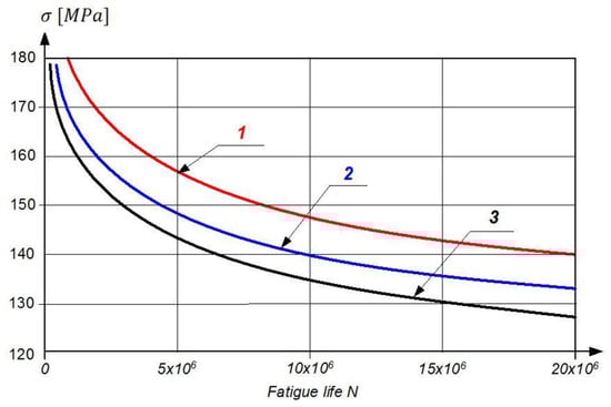 The fatigue curves of turbine blades made of EI-437B, where the working time t = 0 h (1), t = 200 h (2), and t = 400 h (3) [].