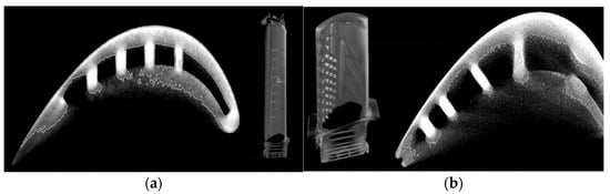 The shape of the LPT blade (a) and the HPT blade (b), with visible cooling channels, obtained by the computer-based micro-tomography CT.