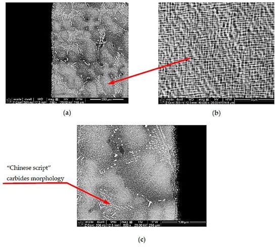 The microscopic observations carried out at magnifications of 100–10,000× (Figure 10) showed that the TWC blade material is characterized by a multiphase structure typical for nickel-based heat-resistant alloys. After the supersaturation and aging process, it consists of the primary, dendritic structure, resulting from the crystallization of the alloy (Figure 10a); the solid solution γ, formed during supersaturation; cuboid intermetallic precipitates of the γ’ phase, released during the aging process (Figure 10b); and reinforcing carbides, with a “Chinese script” morphology (Figure 10c).