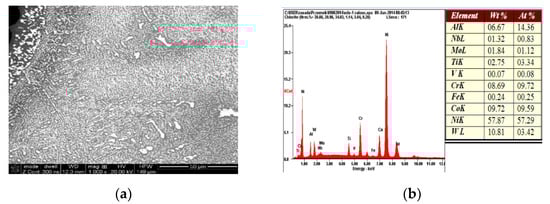 Nevertheless, the microanalysis of the chemical composition of the multi-phase blade structure allowed for the identification of significant discrepancies, mainly in terms of the content of chromium and titanium, between the tested material and the ZhS-32 and ZhS-26 alloys. The chemical composition of the analyzed material of the blades suggests that they are made of an alloy with a chemical composition corresponding to the heat-resistant nickel-based superalloy, MAR-M 200 [], which also corresponds to the chemical composition of the Russian ZhS-6U alloy [] (Figure 11) (Table 2.).