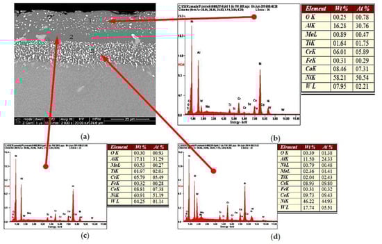 Three-layer barrier nickel aluminides (NiAl), with the coating diffusively applied to the TWC blade material (a), and the results of the microanalysis of the chemical composition in individual areas (b–d).