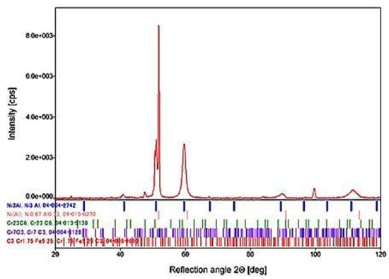 The microscopic observations were confirmed by the XRD analysis. Based on the X-ray phase analysis measurements, by analyzing the positions of the obtained reflections, it was possible to unequivocally confirm the multi-phase structure of the blade material observed during the microscopic observations (Figure 15).