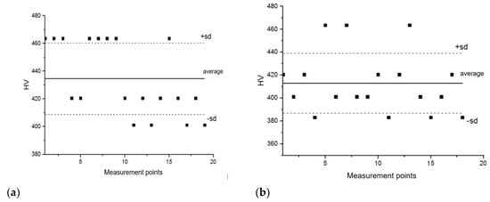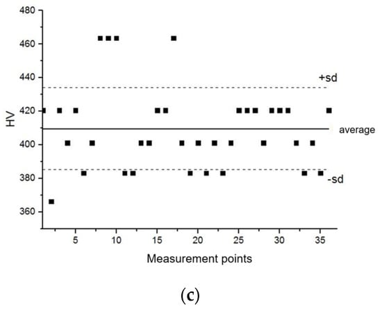 These tests were carried out with the semi-automatic microhardness tester, SHIMADZU-DORERNST M, and the obtained results were subjected to statistical analysis, which confirmed the structural homogeneity of the analyzed material areas, characterized by an average value of microhardness at a statistically uniform level within the range of 410–430 HV 0.025 (Figure 16).