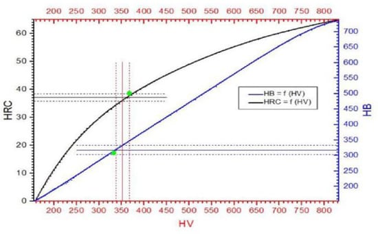 The observed structural changes were reflected in the strength parameters of the alloy used for the construction of the tested blades. As can be seen in Figure 17, where the hardness values obtained are marked with the determined standard deviation, the intersection points (marked in green) of the hardness obtained are located on the curves, which represent the dependency between the Brinell and Rockwell hardness as a function of the Vickers hardness (curves HB = f(HV) and HRB = f(HV)), which clearly proves the correctness of the measurements carried out. It also proves the high homogeneity of the tested material, caused by the refinement of the grain structure, despite its multiphase nature.