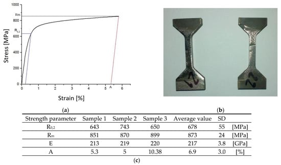 Tensile curve of the blade material (a), view of specimens before and after the tensile test (b), and the determined strength parameters (c).
