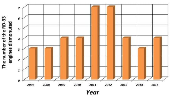 The number of RD-33 engines dismounted from airplanes due to damage to the high-pressure turbine in one of the air bases in Poland during the years 2007–2015 [].