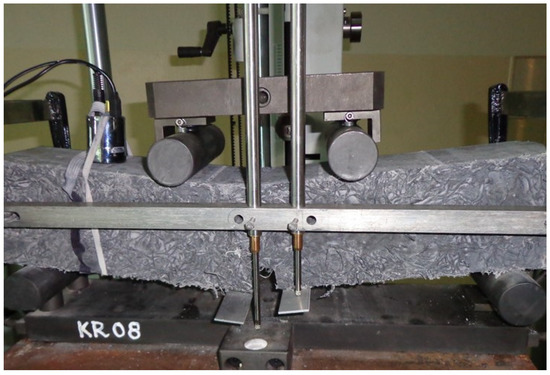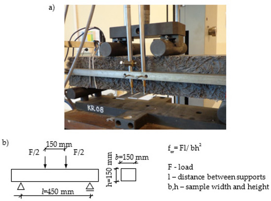 Components were mixed in the concrete mixer, and then used to mould samples. Beams (150 mm × 150 mm × 600 mm) were cast in slabs, and then cured in water at 20 ± 2 °C. After 180 days of ageing, the beams were prepared for the bending test, Figure 2. Figure 2a presents a sample prepared for the four-point bending test.
