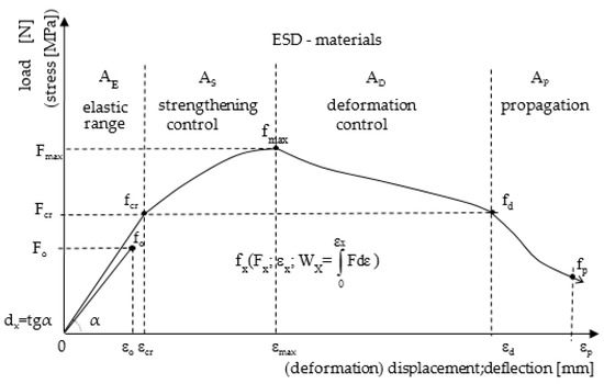 In the presented test results, emphasis was placed again on the need to compare the obtained effects fcr, fmax, fd with the parameters of a reference matrix (without reinforcement). The ESD composites should show greater ability to carry stress in the elastic range, strengthening control area, and a considerable range of deflections in the deflection control area. Assigning appropriate symbols to the tested composites enables the identification of their behaviour under load, and it is possible to describe them in detail on the basis of the characteristic points fx (Fx, load; εx, deflection; Wx, energy and areas AX, Figure 3).