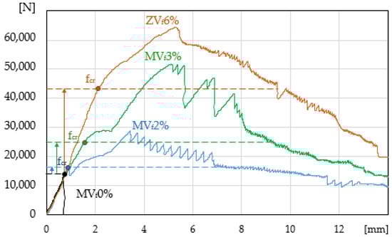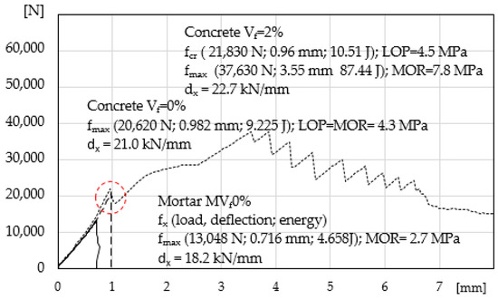 The load-deflection curve for mortar MVf0% is presented in Figure 4. Additionally, the results presented earlier [24] for concrete without fibres and with the maximum volume content of the same fibres Vf = 2% are included (insignificant increase in the elastic range of concretes with the maximum volume of fibres was obtained). A typical load-deflection correlation for cement composites without reinforcement was obtained, with catastrophic destruction process (deflection as displacement of crosshead (mm)). The figure presents data corresponding to the maximum ability to carry stress fcr = fmax = MOR and deformation capacity dx. The specimen is a reference for the other tested composites.