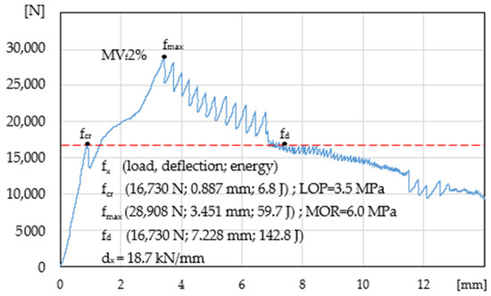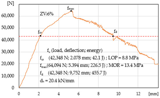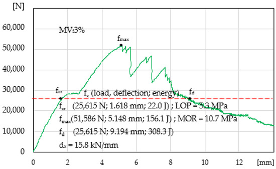 Table 2 presents a compilation of the results of the four-point bending tension test of the tested specimens (load, deflection, absorbed energy, LOP, MOR, and dx) with the data that correspond to various characteristic points fx (fcr, fmax, and fd).