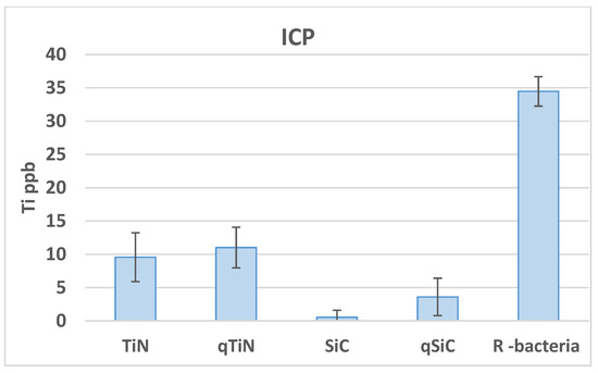 Ti ppb mean values and standard deviation in Ti disks non-coated (R bacteria) and coated (TiN, QTiN, SiC, and QSiC) samples.