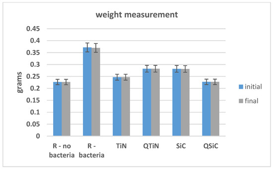 The initial and final weights of coated and non-coated samples were similar in all samples (p = 0.348). We could not observe an obvious difference between the initial and final weight, showing no high degradation on Ti disks after 30 days of cultivation with biofilm (Figure 3).