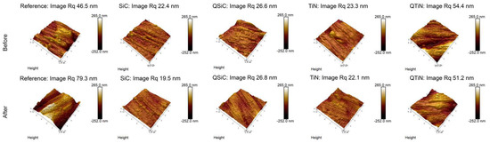 Topographies of Ti, TiN, QTiN, SiC, and QSiC disks were verified using atomic force microscopy (Bruker/Veeco/Digital Instruments NanoScope V). The AFM was operated in tapping mode using a silicon AFM probe (RTESP-300, Bruker, Billerica, MA, USA), with a radius of less than 10 nm and resonance frequency among 200 and 400 kHz.