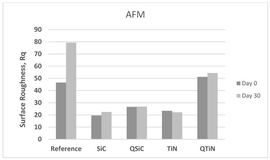 Roughness means values (image Rq) in non-coated (Reference) and coated (TiN, QTiN, SiC, and QSiC) disks initially (Day 0) and after 30 days in cultivation with bacteria.