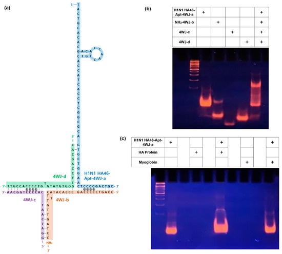 In order to construct a multifunctional bioprobe that detects HA protein, it was necessary to confirm the assembly of DNA 4WJ. The 4WJ consists of four DNA strands. The H1N1 aptamer was incorporated into 4WJ-a, and the amine group was incorporated into 4WJ-b to react with the carboxyl group of carboxyl-MoS2. 4WJ-c,d are sequences that are complementary to the other sequences. Finally, by inserting Ag+ into C-C mismatches, the electrochemical signal width was expected (Figure 2a).